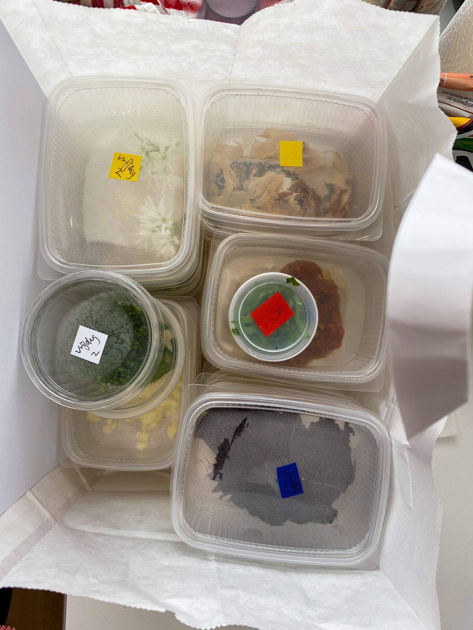 In the bag was a plethora of small containers, each had a coloured sticker on it. Each colour represented each course, so that you know which ingredients belong to which dish.