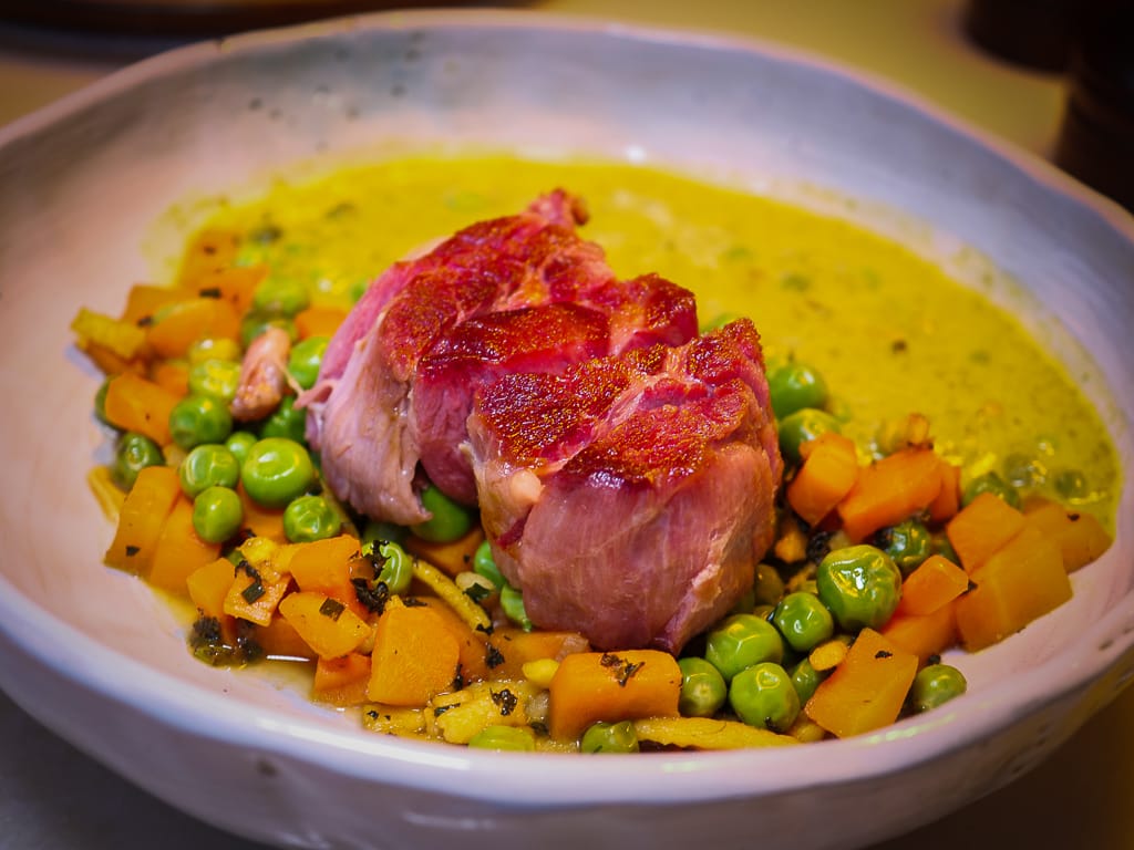 My first dish, white asparagus, arrived on a bed of pearl couscous, nestled in an almond and elderflower foam. For those familiar with white asparagus, you know it often lacks bold flavours. However, the way Chef Giovanni prepared it, was quite the revelation. The almond and elderflower flavours blended perfectly with the asparagus. The texture of the slightly chewy pearl couscous, the soft asparagus and the crunch of the almond flakes made the whole dish extra interesting.