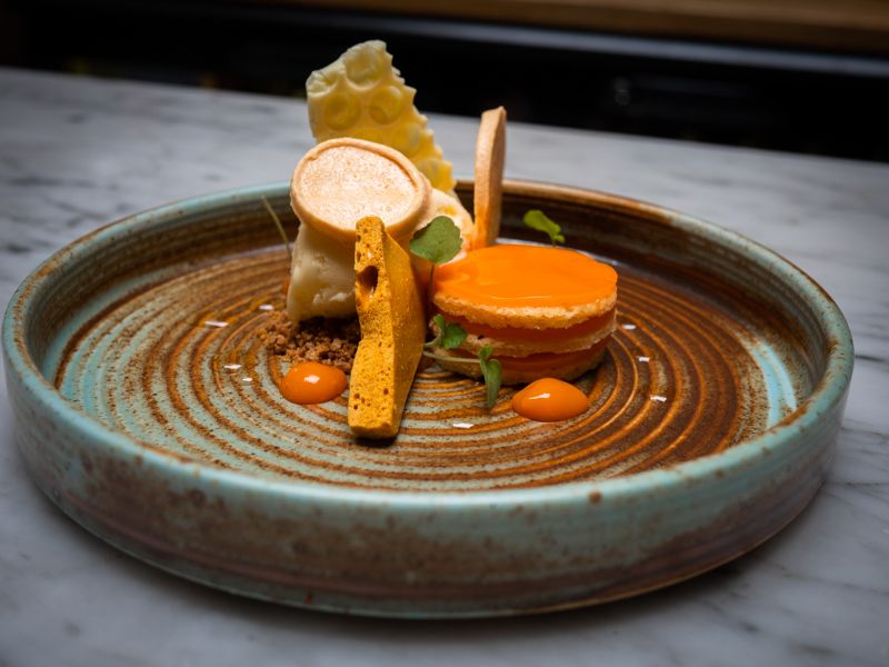 I finished off my lunch with a beautiful dessert that consisted of honey, orange, carrot and ginger elements. It had a merengue of carrot, layers of an orange jelly and ginger atop one another, a piece of white chocolate made from an imprint of bubble wrap, a honeycomb of caramelised honey and baking soda, and a dollop of vanilla and confit ginger ice cream. The droplets of the pine needles syrup added an extra sweet finishing touch.